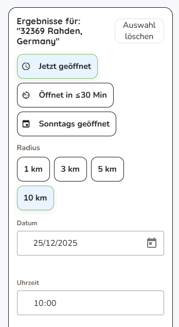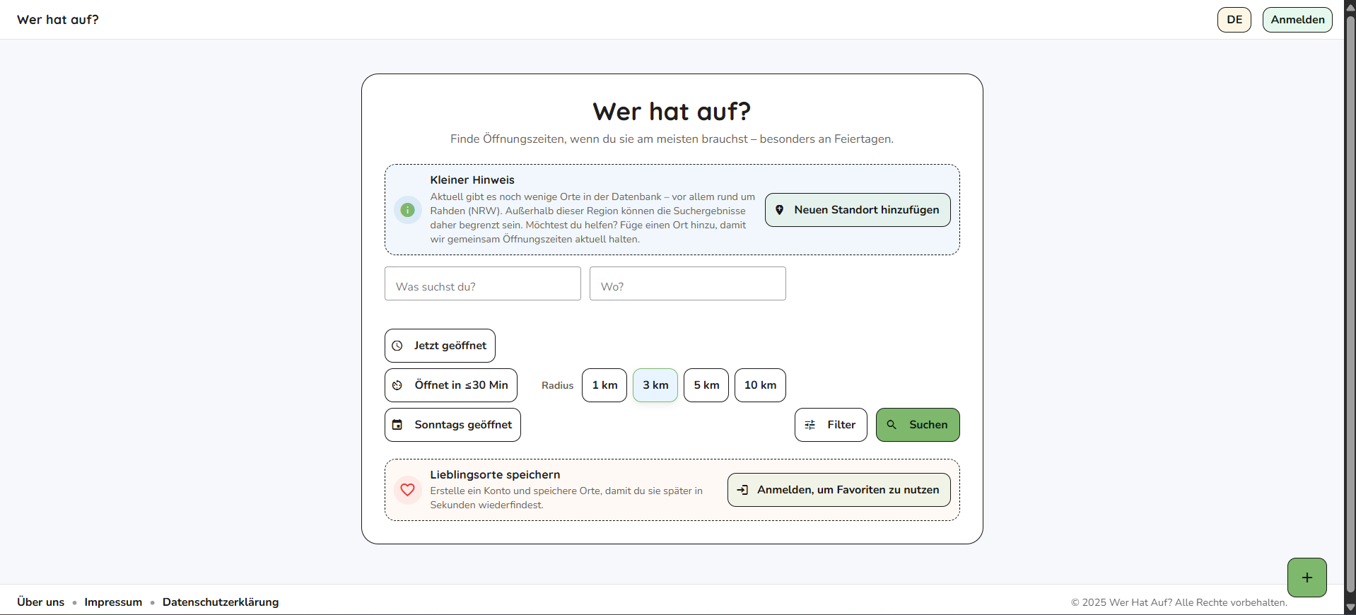 Register your business for free and provide your customers with clear opening hours in one place, instead of scattered across the front door, website, Facebook, or Instagram. Wer Hat Auf? offers: